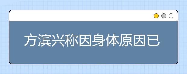 人民网北京6月27日电(记者 仝宗莉)据北京邮电大学网站消息,北京邮电大学校长方滨兴在2013届本科生毕业典礼上的讲话中透露,由于过度透支自己的身体,同时也没有拿出足够的时间来补充,所以一场大病让他失去了能够通宵达旦工作的资本,不能再像过去一样双肩同时挑起学术、管理两副重担。鉴于此,他已向主管部门提出不再连任北邮校长职务。
